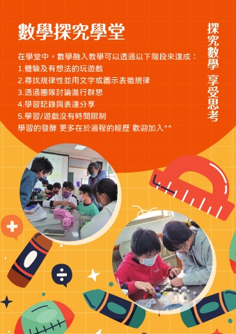 Ꮠላ୳ڀላಊ 在學堂中,數學融入教學可以透過以下階段來達成: 1.體驗及有想法的玩遊戲 2.尋找規律性並用文字或圖示表徵規律 3.透過團隊討論進行群思 4.學習記錄與表達分享 5.學習/遊戲沒有時間限制 學習的發酵 更多在於過程的經歷 歡迎加入^^