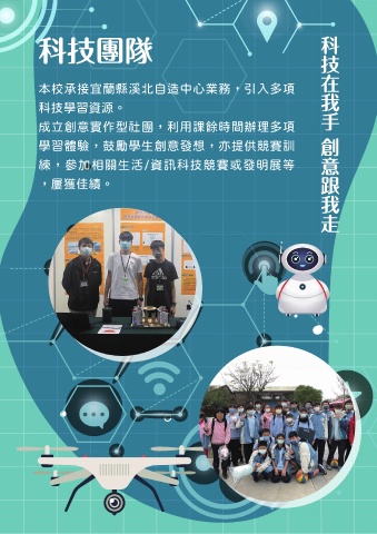 Պٕᅶୂ 本校承接宜蘭縣溪北自造中心業務,引入多項 科技學習資源。 成立創意實作型社團,利用課餘時間辦理多項 學習體驗,鼓勵學生創意發想,亦提供競賽訓 練,參加相關生活/資訊科技競賽或發明展等 ,屢獲佳績。