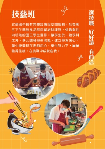 ٕ൝ 宜蘭國中擁有完整設備與空間規劃,於每周 三下午開設食品群與餐旅群課程,供職業性 向明確的國三學生選修。讓學生於一般學科 之外,多元開發學生潛能,建立學習信心。 蘭中技藝班在老師用心、學生努力下,屢屢 獲得佳績,在挑戰中成就自我。