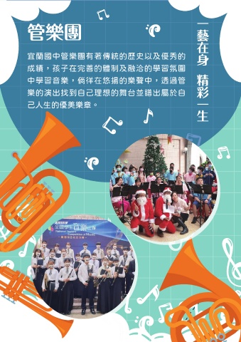ᒜᅶ 宜蘭國中管樂團有著傳統的歷史以及優秀的 成績,孩子在完善的體制及融洽的學習氛圍 中學習音樂,倘徉在悠揚的樂聲中,透過管 樂的演出找到自己理想的舞台並譜出屬於自 己人生的優美樂章。