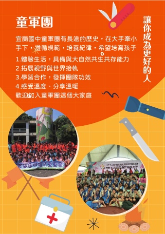 ಐ܉ᅶ 宜蘭國中童軍團有長遠的歷史,在大手牽小 手下,遵循規範,培養紀律,希望培育孩子 1.體驗生活,具備與大自然共生共存能力 2.拓展視野與世界接軌 3.學習合作,發揮團隊功效 4.感受溫度、分享溫暖 歡迎加入童軍團這個大家庭